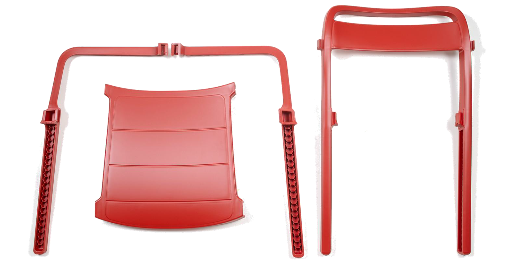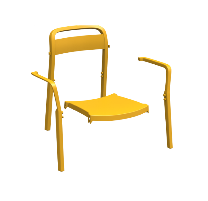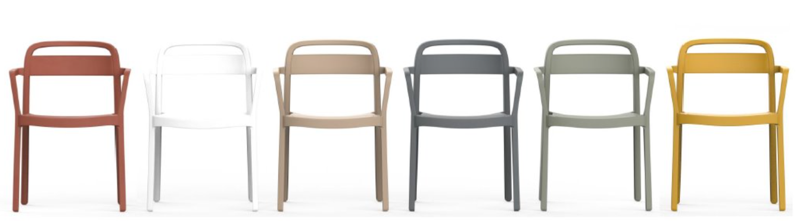 June, silla monobloc, que se monta sin herramientas. Ligera, apilable y reciclada con un sistema de montaje sin tornillos ni herramientas que está en proceso de patente. Click, sit y listo!
