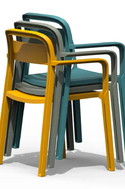 La silla June, es ligera y fácil de transportar. Cuenta con un diseño de embalaje plano con asa. Este formato flatpack con asa, facilita su carga y transporte ya que puedes llevarte varias a la vez. Menos volumen, menos emisiones, más eficiencia.