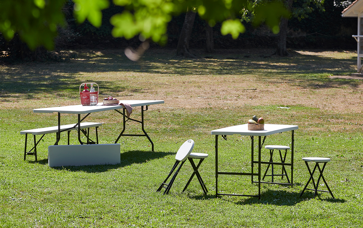 Picture this: a random Saturday, you pack a couple of Easy Stools, the Easy Table 75 and a basket filled with something delicious. Thirty minutes later, you’re surrounded by trees, setting up an improvised lunch in the fresh mountain air. Or maybe it’s a lazy Sunday afternoon in your backyard, celebrating a kid’s birthday with friends. Wide and sturdy tables, like the Easy Table 243, that unfold in seconds and handle it all — games, laughter and toasts that last until sunset.