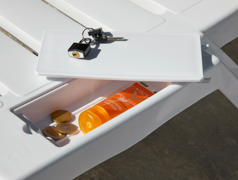 Master includes smart features designed for real use in shared or public terraces. On the right, it includes a cup holder; on the left, an optional storage box with a lid for personal belongings. This box can be locked, allowing you to swim without worry. Small design decisions that bring comfort and peace of mind to shared spaces.