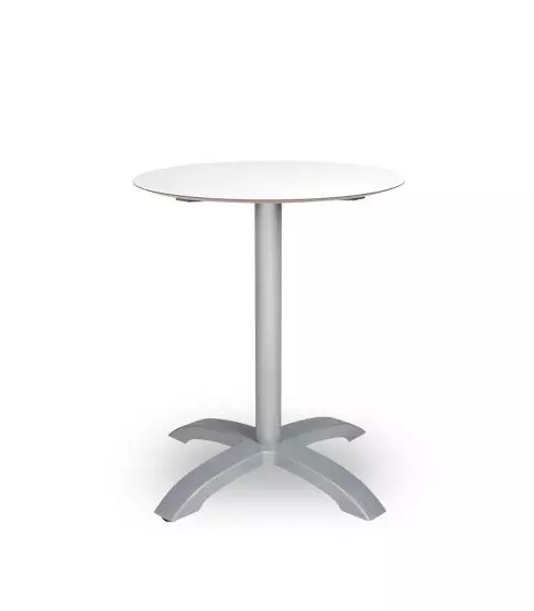 Table for indoor and outdoor with cast aluminium base. Shiny or matt painted finish. Anodized aluminium tube, ø 60 x 2 mm thick. Non-turn notch. Steel counterweight 4.5 kg (9.90 lb). With regulators in all 4 legs. Table top in high pressure laminate (HPL).
