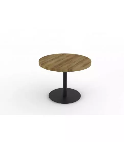 Mesa para uso interior. Pie central de hierro fundido pintado para uso interior. Tubo de Ø 80 mm con muesca antigiro. Base de Ø 66 cm. Sobre en Durolight.