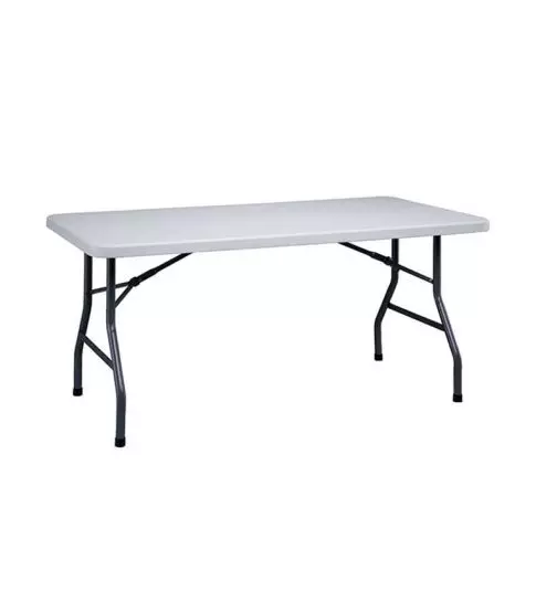 Mesa plegable con estructura de acero pintado y sobre de polietileno de alta densidad, en color gris claro. Grosor del sobre: 45 mm. Sobre estanco de una sola pieza sin uniones. Peso neto: 12 kg. Travesaños ergonómicos. La unión de 2 mesas Mahler permite una composición de 150 x 150 cm. Sistema de unión longitudinal de mesas.