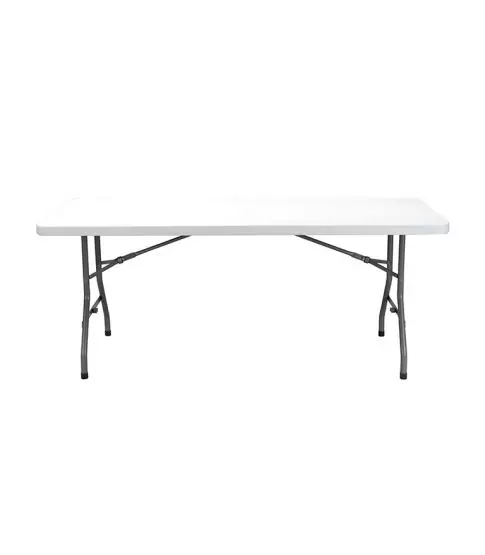Mesa plegable con estructura de acero pintado y sobre de polietileno de alta densidad, en color gris claro. Grosor sobre 45 mm. Sobre estanco de una sola pieza sin uniones. Peso neto 18,5 kg. Travesaños ergonómicos. Sistema de unión de mesas.