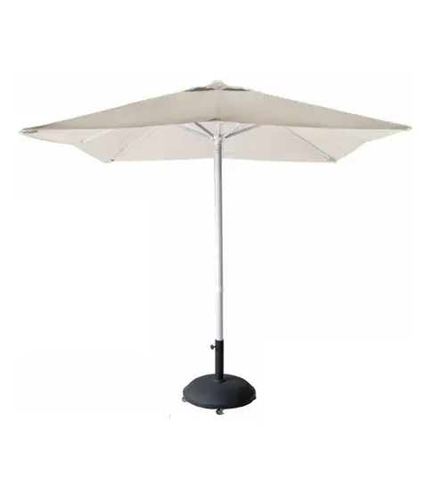Parasol cuadrado 2x2 m, de doble polea. Mástil de aluminio de una sola pieza lacado blanco de Ø 48 mm. 8 varillas de aluminio de 18x28 mm. Gramaje de la tela 300 g/m3. Poliéster. No incluye pie.