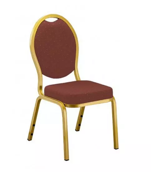 Silla apilable de aluminio lacado y espuma inyectada tapizada. Disponible en tela estándar y -bajo pedido- en CRIB-5. Estructura oro.